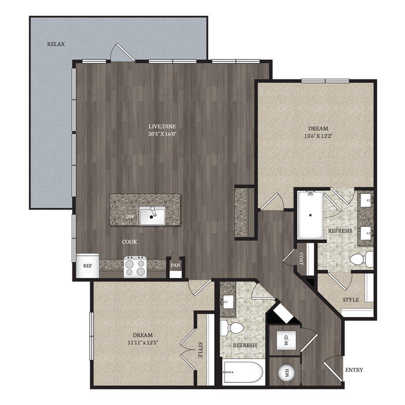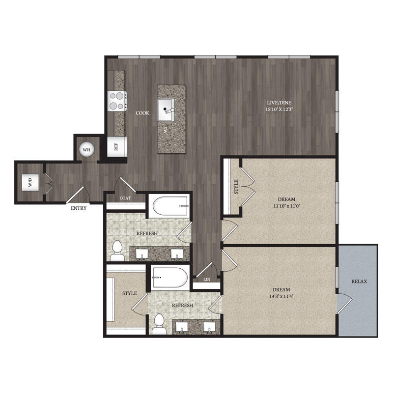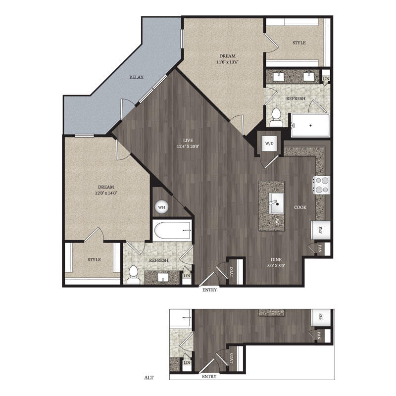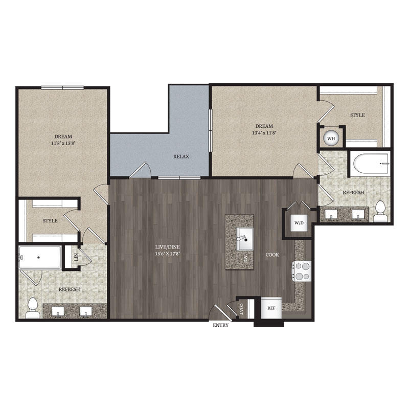 2 Bed – 2 Bath 1216 – 1294 Sq Ft Rent: $2390 – $2435